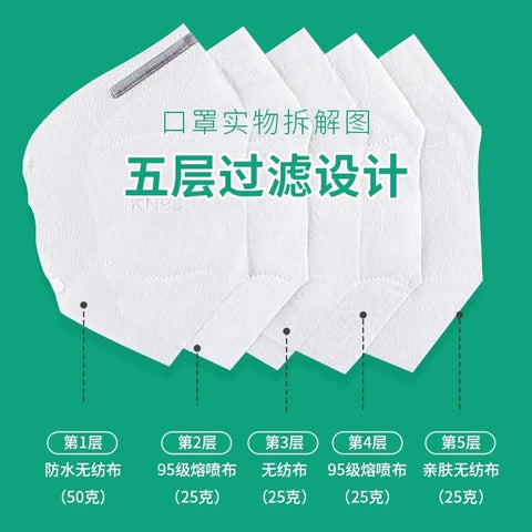 KN95口罩过滤率达99%,而这款KN95口罩里里外外足足有五层,多重过滤更安心。对于口罩真正能发挥过滤作用的关键滤材——熔喷布,它更是有两层95级熔喷布,可有效保护呼吸健康!层层过滤,守护你的每一次呼吸~