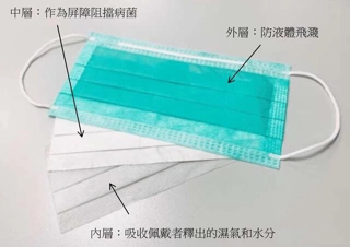 一般有三层,从外到内分别是防水层、过滤层、舒适层,舒适层是一层纱布,佩戴时要注意白色的纱布朝内,蓝色(深色)的防水层朝外,有金属片的一边朝上。